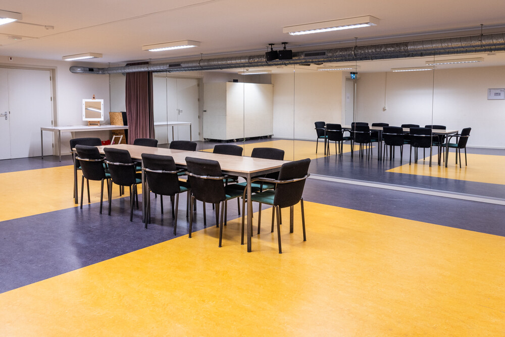 Toneel -1 is een ruimte waar danslessen gegeven kunnen worden. Er is een grote spiegelwand.